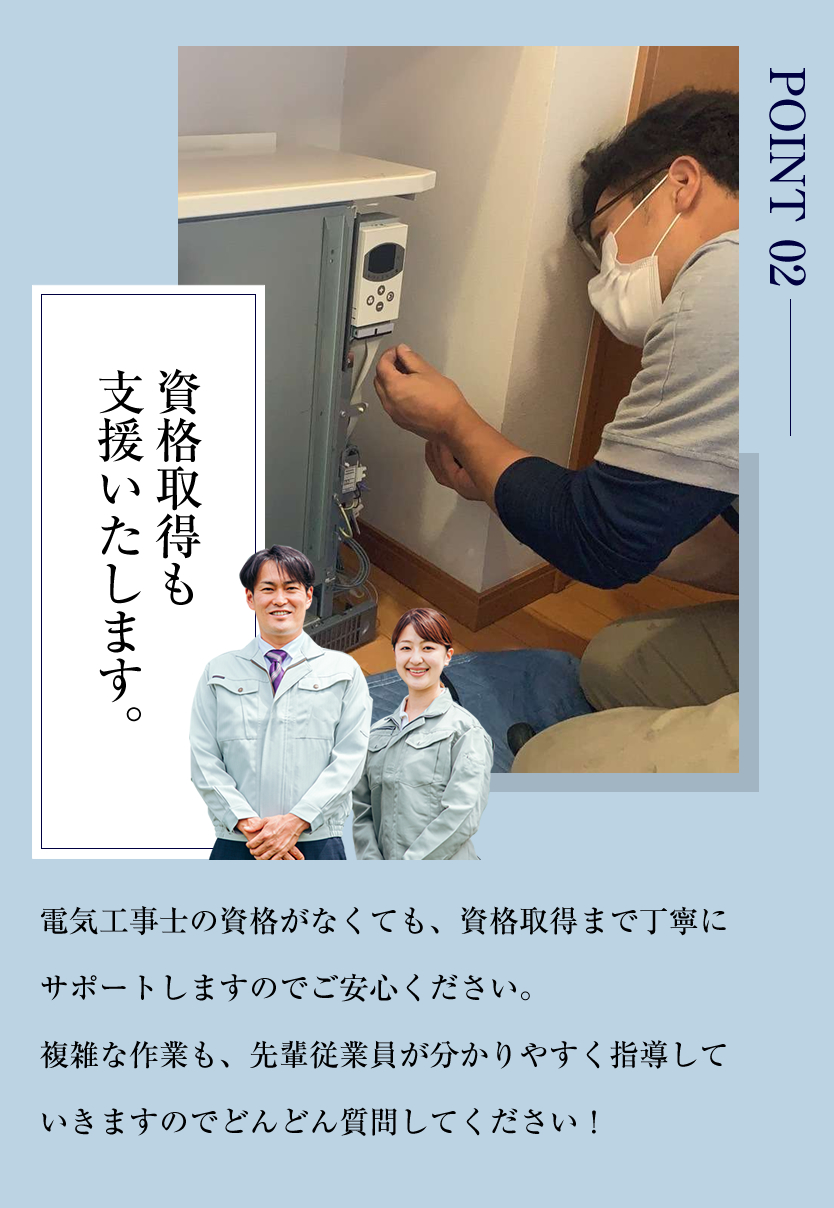 屋内や屋外のコンセント・照明用のスイッチ増設やエアコンに関する工事、テレビやアンテナに関するトラブル、アンテナの設置や撤去、換気扇の取り付けや防犯設備の設置、そして通信設備に関することなどご家庭内のあらゆる電気工事を滋賀県内で行っております。 電気工事が未経験の方は材料運びなど、簡単な作業からお任せします。また事務作業は無く片付けや次の日の準備を済ませたら帰宅OK!資格取得支援制度も設けており、着実にステップアップできます。